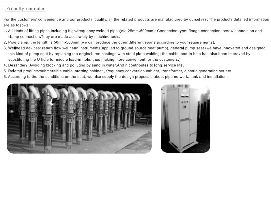 2. There are no special requirements for the well pipe, and the water delivery pipe can only bear the corresponding pressure. 3. The installation, use and maintenance are convenient and simple, and the floor area is small, so there is no need to build a pump room. 4. Simple structure, saving raw materials.