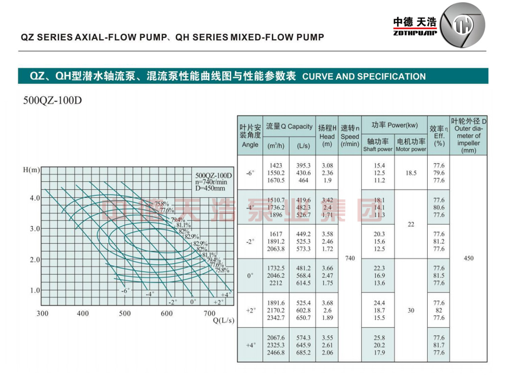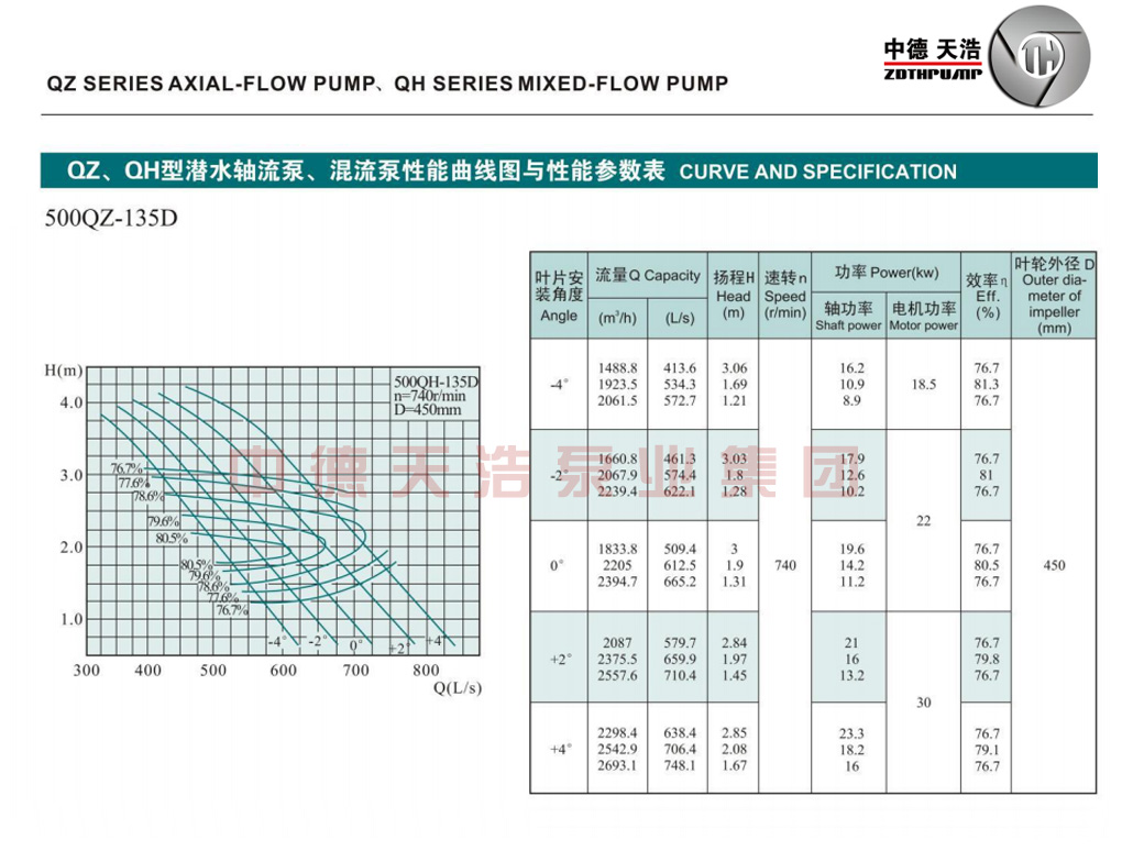 QZ、QH系列泵具有单机流量大,扬程幅度宽,效率高等特点。潜水电机与水泵体式结构, 潜入水中运行,具有传统机组无法比拟的优点: